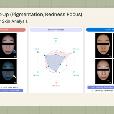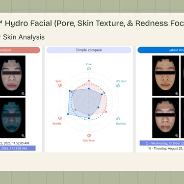 Skin analysis reports are used as a reference tool to help understand overall skin condition and changes over time. Certain data points, such as wrinkle detection, may not always be fully precise, as hair, eyelashes, and eyebrows can sometimes be interpreted as wrinkles by the analysis system.